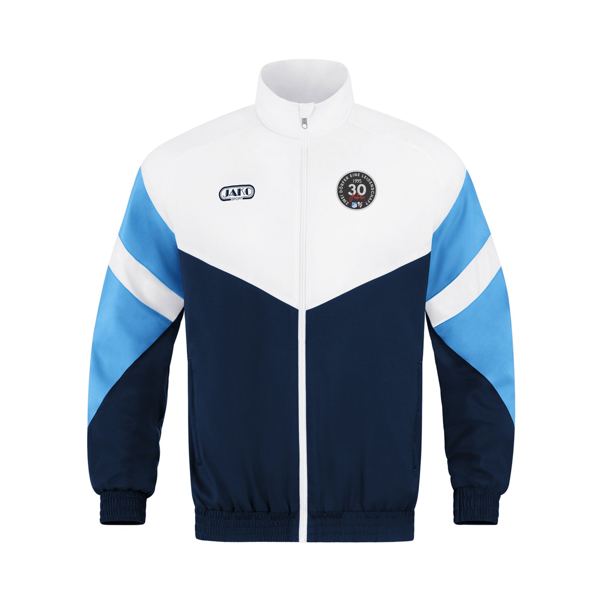 Moderne Freizeitjacke im authentischen Retro-Look – inspiriert von den frühen JAKO Jahren und versehen mit dem originalen JAKO Logo von 1992. Farbige Kontraststreifen an den Ärmeln und ein schlichter Brustbereich. Das Hauptmaterial aus recyceltem Polyester und das leichte Mesh-Innenfutter sorgen für angenehmen Tragekomfort.